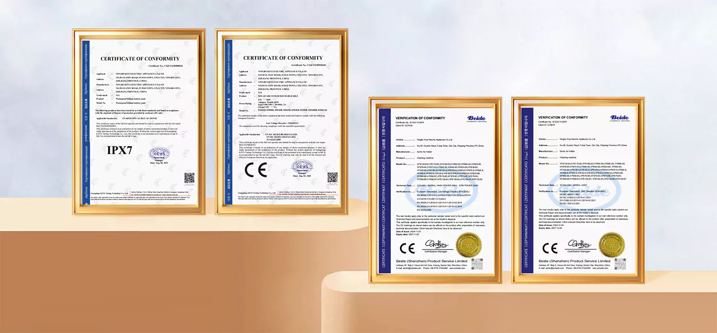 Наше машине за прање веша и хладњаци ваздуха су прошли стандарде тестирања ЕУ и добили ЦЕ сертификат. Батерија има ИПКС7 водоотпорност. Такође смо сертификовани као изванредни продавци на домаћим платформама за е-трговину и Алибаби.